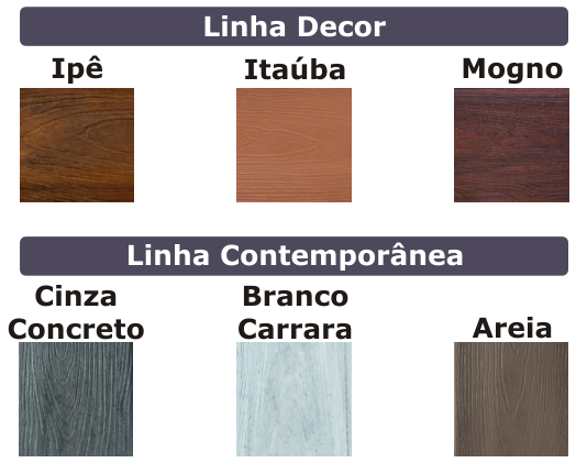 - Tem aparência de “madeira”, inclusive com textura que além de embelezar, tem função anti-derrapante;